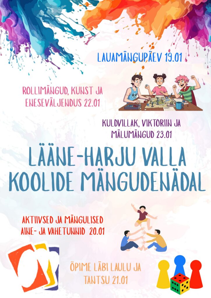19.–23. jaanuaril toimub Lääne-Harju valla koolides mängudenädal, mille eesmärk on tuua koolipäevadesse rohkem rõõmu, loovust ja koos tegutsemist. Nädala jooksul on fookuses nii lauamängud, liikumine, kunst kui ka eneseväljendus. Aktiivseid tegevusi veavad vahetundides eest õpilasesindus, noorsootöötaja Aleksander ja noorte heaolu spetsialist Ekaterina.